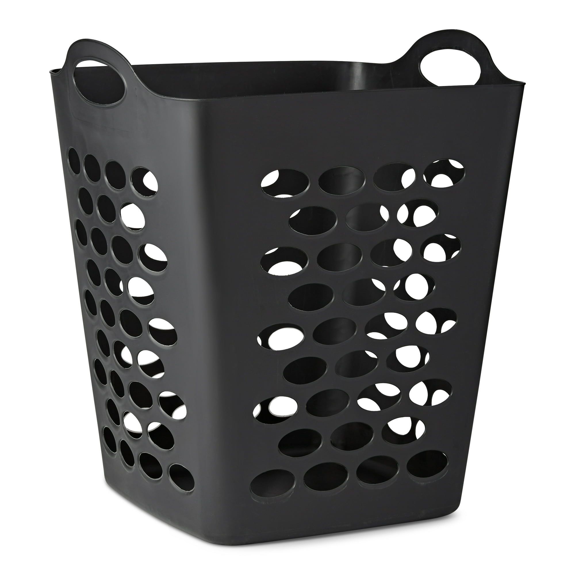 The Flexible Black Laundry Hamper offers practical storage for busy households, holding up to 2 bushels of clothing in a space-saving square design. This durable plastic hamper features a geometric pattern of ventilation holes that allows garments to breathe, helping prevent musty odors and mildew. With sturdy dual handles, transporting laundry from bedrooms to the washing machine becomes effortless, even with heavier loads. The lightweight yet robust construction makes this hamper perfect for adults and teens alike, while its sleek black finish looks neat in any bathroom, bedroom, or closet. The Flexible Black Laundry Hamper combines functionality with style, keeping clothes organized until laundry day.