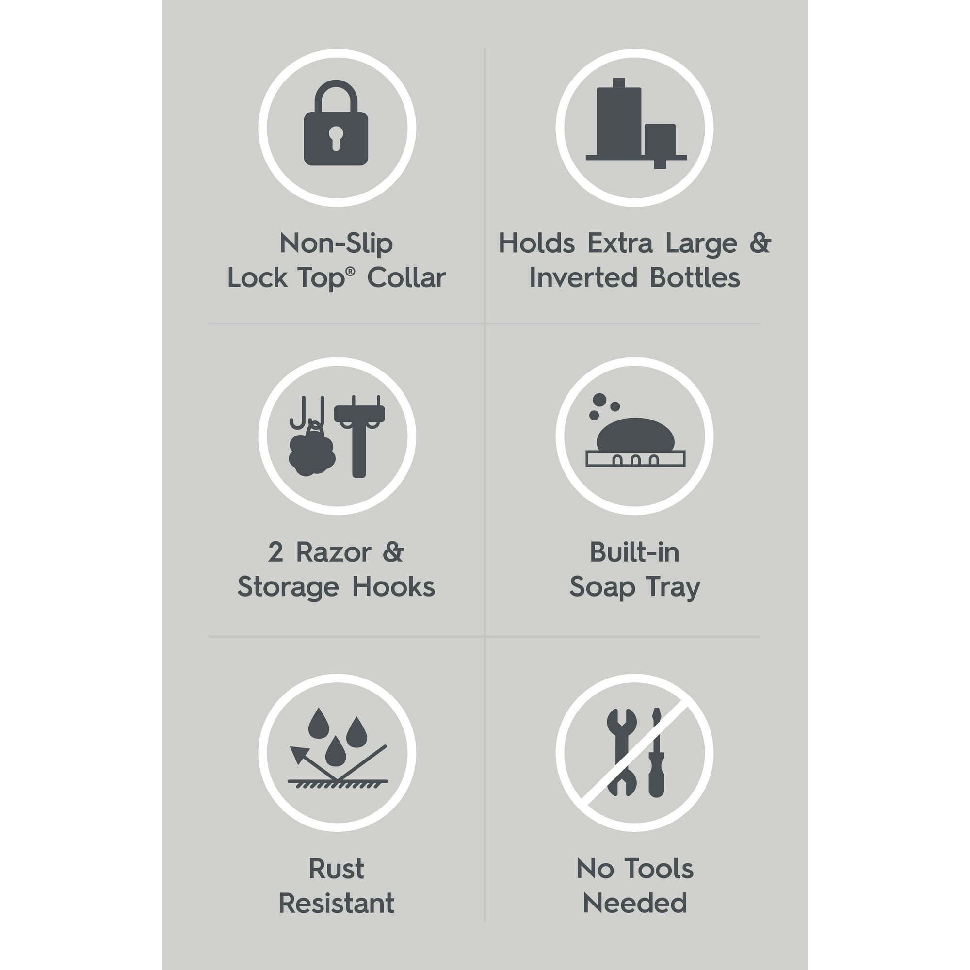 This easy-to-install Better Homes & Gardens Shower Caddy offers an accessible and organized storage solution for any cluttered shower space. The 2-shelf hanging caddy slips over any standard showerhead. Its exclusive Lock Top mechanism ensures easy, tool-free installation and a secure hold, with no slipping, swaying or sliding. The rust-resistant metal caddy can easily hold large bottles. For in-the-shower convenience, inverted bottle storage is built into its shelves for quick dispensing of shampoo, conditioner and more. A soap tray with hooks for razors and hanging storage adds to the caddy's versatility.