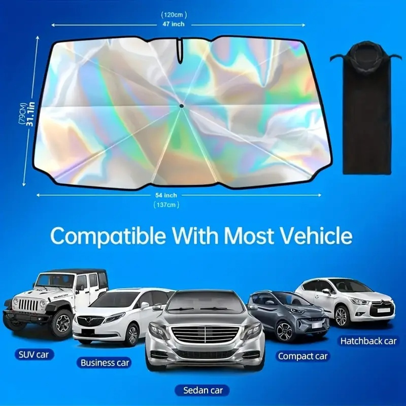 Key Features:Military-Grade Sun Protection – Blocks 99% UV rays & reduces cabin temps by 40°F (10-layer fabric technology)Vibrant Rainbow Reflective Surface – Unique prismatic coating reflects sunlight while adding stylish flairUniversal 55"x31.5" Size – Fits 95% of vehicles (sedans/SUVs/trucks) with 2" extra coverage on sides2025 Upgrades Include:Diamond-Weave Fabric – 30% more durable than 2024 modelsQuick-Dry Coating – Shakes off rain/condensation instantlyMagnetic Side Flaps – Secures to door frames in windy conditionsGPS-Friendly – Doesn't interfere with satellite signals